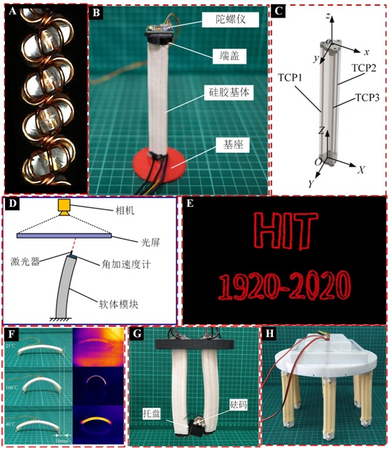 A:人工肌肉展示;B:软体模块展示;C:软体模块结构组成;D:光轨迹实验;E:使用自传感人工肌肉驱动软体模块绘制的光轨迹;F:单个软体模块驱动的爬行机器人;G:两个软体模块驱动的手爪;H:六个软体模块驱动的足式机器人。