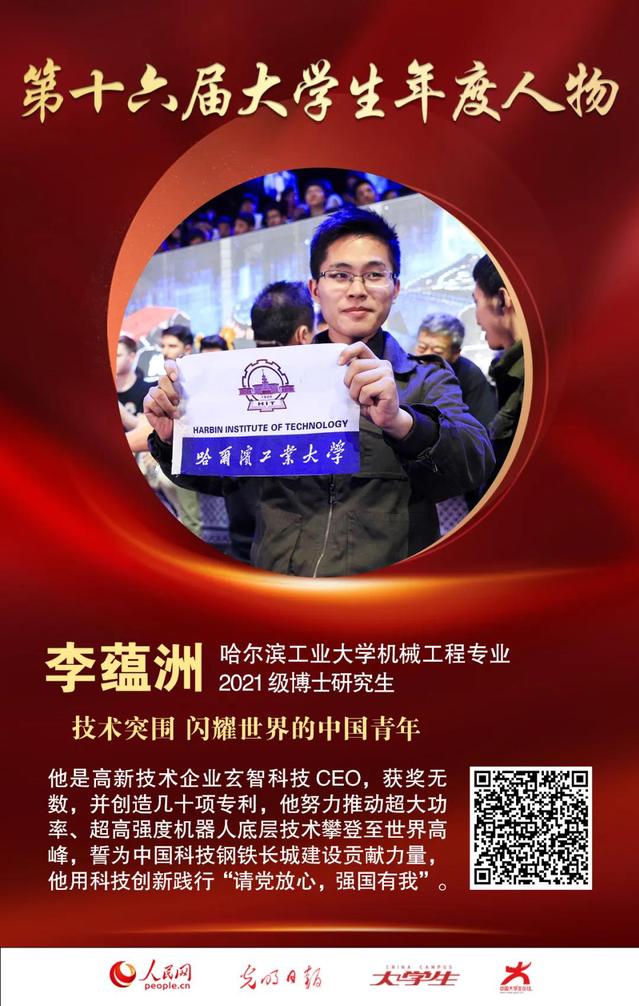 李蕴洲,中共党员,哈尔滨工业大学机器人研究所博士,全国优秀共青团员,哈尔滨市青联委员,高新技术企业玄智科技CEO。牵头研发了无线射频的安全电子围栏,静/动载复合吸能装甲,大能量密度电机驱动系统等技术,创造专利90余项?;瘛按辞啻骸敝泄嗄甏葱麓匆荡笕鸾?、全国大学生机器人大赛机器人创业赛特等奖等创新创业大奖70余项。2018年,作为中国青年代表参加APEC峰会。在2019世界重量级格斗机器人大赛中夺冠,推动超大功率、超高强度机器人底层技术攀登至世界顶尖层次。2021年7月,李蕴洲受共青团中央邀请,以“请党放心,强国有我”为主题录制线上演讲,向全国青年分享他改革创新、奋发作为、追求卓越的成长故事。