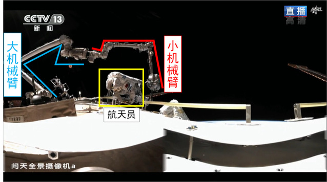 神舟十四号航天员乘组今天进行第三次出舱活动,此次出舱是空间站“T”字形三舱构型建成后的首次出舱。此次任务中,小机械臂通过机械臂转接件与大机械臂组合起来,实现双臂间电气和信息的互联互通。“双臂合一”后,整个机械臂系统活动范围更大、操作自由度更多,实现了航天员更大范围的快速转移,进一步提高航天员的舱外工作效率。