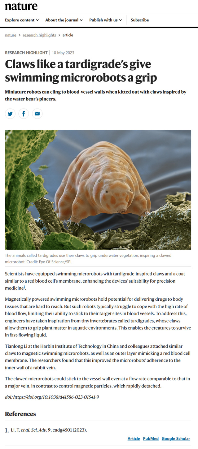 近日,机器人技术与系统全国重点实验室、哈尔滨医科大学第一附属医院等联合开发出仿水熊虫医用微纳机器人,可实现在静脉血高速流环境中可控运动及靶向驻停,相关成果以《可在血管中靶向驻停的仿水熊虫医用微纳机器人》(Bioinspired claw-engaged and biolubricated swimming microrobotscreating active retention in blood vessels)为题,发表在《科学进展》(Science Advances)上。同时,《自然》(Nature)杂志以《仿水熊虫爪形结构为游动微纳米机器人提供抓地力》(Claws like a tardigrade’s give swimming microrobots a grip)为题将该成果作为研究亮点(Research highlight)进行报道。