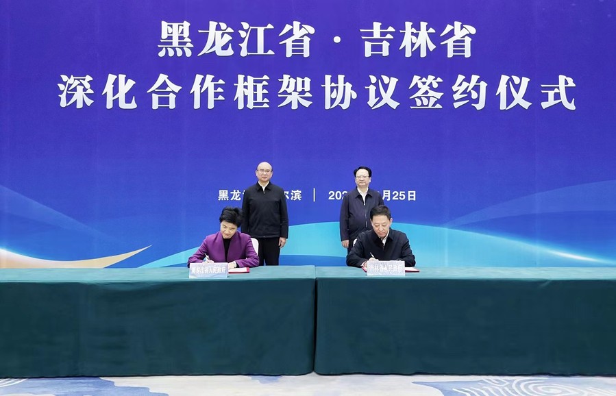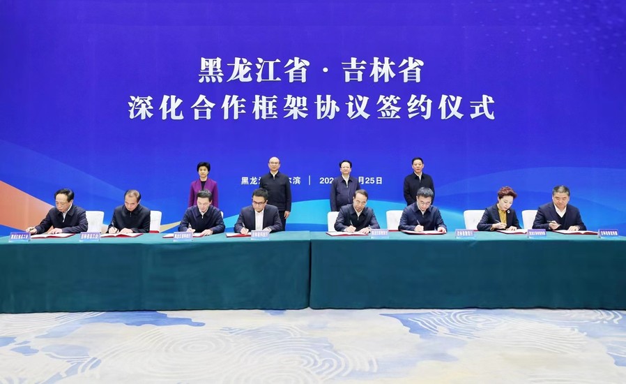 25日,省委书记、省人大常委会主任许勤,省委副书记、省长梁惠玲在哈尔滨会见吉林省党政代表团一行,共同学习贯彻习近平总书记在新时代推动东北全面振兴座谈会上的重要讲话和中央经济工作会议精神,共话两省合作愿景,共担东北振兴使命。吉林省委书记、省人大常委会主任景俊海讲话,吉林省委副书记、省长胡玉亭出席。梁惠玲、胡玉亭代表两省签署《黑龙江省人民政府 吉林省人民政府深化合作框架协议》。省委副书记张安顺出席活动。