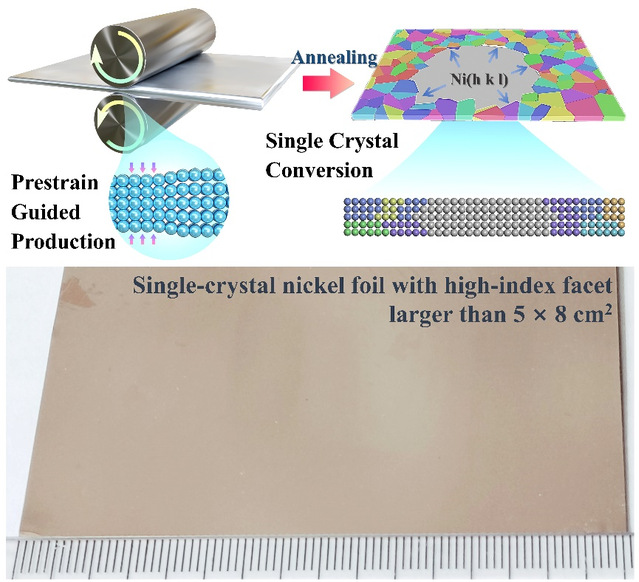 近日,实验室胡平安教授团队在大尺寸高指数晶面单晶金属制备领域取得重要进展。相关成果以《预应变诱导制备大尺寸高指数晶面单晶镍箔》(Prestrain Guided Yield of Large Single-Crystal Nickel Foils with High-Index Facets)为题发表在《先进材料》(Advanced Materials)上。