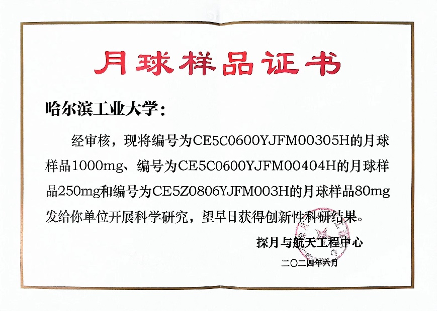 6月17日,由哈工大机电学院邓宗全院士团队姜生元教授牵头,哈工大与航天五院总体设计部、北京卫星制造厂组建的联合研究团队在中国科学院国家天文台领取了1330mg由嫦娥五号带回的月球科研样品,其中钻取样品一份、铲取样品两份。姜生元为该批月球科研样品使用责任人。这是国家航天局探月与航天工程中心首次将月球样品批复给采样探测工程团队开展科学研究。